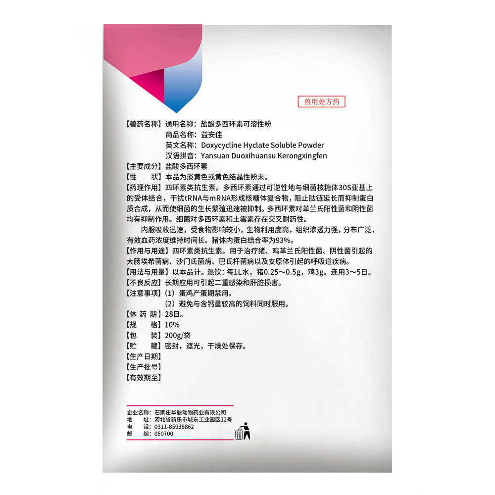 Introducing Doxycycline Hyclate Soluble Powder, the ultimate solution for combating mycoplasma, Escherichia coli mixed infection, balloon inflammation, and other related diseases. This revolutionary product has been specifically formulated to provide effective treatment and relief to animals suffering from these conditions. With its unique soluble powder form, Doxycycline Hyclate offers easy administration and rapid absorption, ensuring swift action and optimal results.